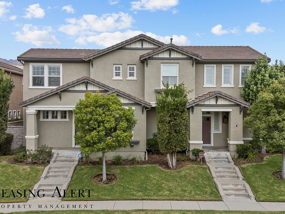 Welcome to 11448 Wistful Vista Way, a spacious 3-bedroom, 3-bathroom home located in the highly desirable Promenade at Porter Ranch Association. This gated community offers top-notch amenities including a guard-gated entrance, sparkling pool and spa, BBQ area, and lush green spaces. Inside, this two-story home features an inviting living room with a cozy fireplace, recessed lighting, ceiling fans, and plenty of natural light. The kitchen is equipped with a refrigerator, microwave, stove/oven, and dishwasher. Upstairs you'll find generously sized bedrooms, including a massive walk-in closet, dual vanities, and a bathtub. Flooring includes tile and carpet throughout. Washer and dryer hookups are conveniently located in the home, and the property also includes a private patio and attached 2-car garage. Enjoy the prime location just minutes from Porter Ranch Town Center, The Vineyards shopping and dining, movie theaters, Valley Country Club, YMCA, and easy freeway access. This home offers both comfort and convenience in one of the most sought-after neighborhoods in the Valley. Tenant is responsible for all utilities.