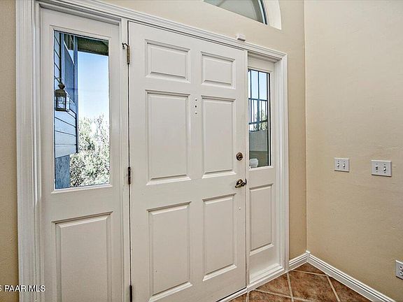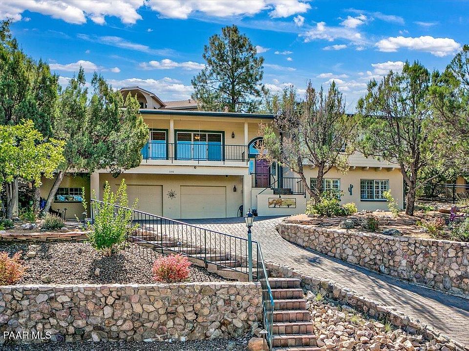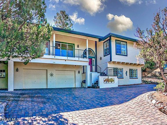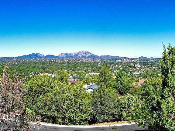 Well, hello Granite Mountain and Thumb Butte! Impressive curb appeal and located in the tall pines and close to the downtown Courthouse, this home was specifically designed to highlight the magnificent views from the great room and west facing front deck. The few stairs climb is well worth it! Wonderfully laid-out floor plan with expansive wood floor living room that could serve as a great room with dining area or utilize the adjoining kitchen area featuring a brick fireplace for a lovely dining experience. A wall of sliding doors provides light as well as easy deck access for relaxation and entertaining. Kitchen features stainless appliances, built-in family style seating, and access to fenced backyard, private patio, and hot tub. Primary bedroom takes advantage of the mountain vistas and ensuite features jetted tub and walk-in closet with built-ins. Guest bedroom or office is also on the main level. Lower level offers a comfy environment for guests with two addt'l bedrooms, bath, laundry, and a secret access wine cellar. Bonus workshop or workout room off the garage provides a versatile space for projects. HOA amenities include pool, clubhouse, tennis, and RV parking. Priced to allow you the opportunity to make it your own.