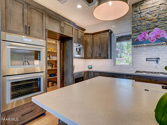 Located within the exclusive, gated community of High Valley Ranch, this luxurious mountain contemporary retreat was expertly built by James & James Construction Corp in 2023. The home exemplifies a harmonious blend of craftsmanship and natural beauty, offering both privacy and sophistication in one of Prescott's most desirable settings. Designed for comfortable main-level living, the residence features expansive windows that capture views of pine trees, mountains, and the city. The spacious kitchen boasts a secret pantry with a dry bar and a built-in coffee/espresso/latte machine. Together, these elements seamlessly connect the elegant interior to the serene natural surroundings.Privately set on 2.09 acres among towering ponderosa pines, this 3,912 sq ft home offers 4 bedrooms plus office, 5 baths, a 3.5-car garage, lower-level family room with wet bar, and a bonus room ideal for a gym. Outdoor living is unmatched with upper and lower decks plus a stone patio--ideal for sunrise coffee, sunset wine, or relaxing after a day of hiking and biking on nearby trails. The craftsmanship and efficiency of new construction ensure lasting comfort and peace of mind. Located just 4.6 miles from historic downtown Prescott, this home blends modern design, outdoor adventure, and the serenity of the pines into one rare lifestyle opportunity.