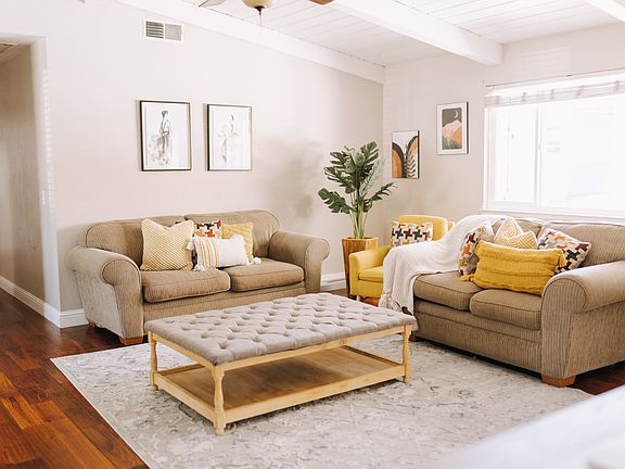 This stunning home boasts 4 spacious bedrooms and 2 baths, featuring a welcoming split floor plan. The living room and master suite are enhanced by vaulted wood ceilings with exposed beams, adding charm and character to the space. Beautiful engineered hardwood floors flow throughout the home, providing a sleek and modern feel.