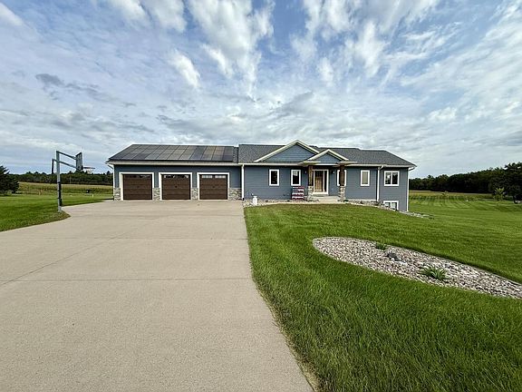The time may be right to tour this high end custom built home. The property is 6 years new and ready for new ownership. This Ranch style house offers 4 bedrooms and 3 full bathrooms. The kitchen offers a large island with custom cabinets and quartz countertops, and includes a walk in pantry. In addition to that there is Main floor laundry with a locker system right off the 3 stall attached garage. The lower level is mostly finished and has much to offer for all, a slide to expedite your arrival to a large Rec Room and play area w/full bath. There is a geothermal heating system w/Electric heat pump, lower level has in-floor radiant heat and main floor has forced air. Also included is 33 solar panels 10.2 kW. This is a move in ready home, schedule your appointment today.