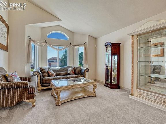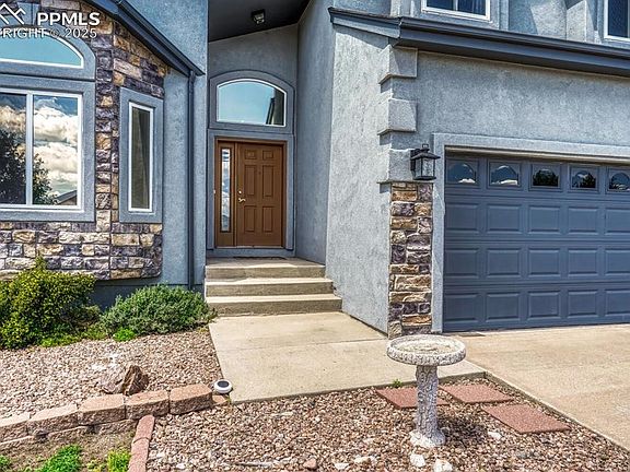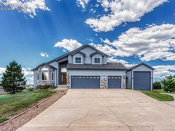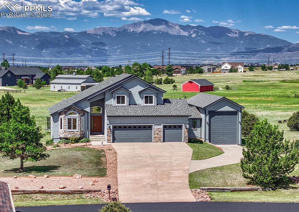 6BR, 4BA private sanctuary tucked away on a cul-de-sac in the vibrant Woodmen Hills community. Situated on a 1.54-acre cul-de-sac lot backing to open space, this 2-story home offers 3,936 sq ft of beautifully designed living space with sweeping views of the Front Range & iconic Pikes Peak. From the slate-tiled entry to vaulted ceilings & wood floors through most of the main level, every detail invites comfort. The sun-filled living/dining area features a bay window & neutral carpet, while the open-concept family room boasts a wall of windows, a cozy fireplace with slate surround, & flows into the dining nook & kitchen. The kitchen is a chef’s dream with a breakfast bar, pantry, tile countertops, & ample cabinetry. Stainless steel appliances include a gas range, built-in microwave, dishwasher, & side-by-side fridge. Step out to the backyard deck & enjoy golden Colorado sunsets & fabulous Peak views. The main-level primary suite is a serene escape with breathtaking mountain views & a spa-like 5-piece bath with dual sinks, jetted tub, tiled shower, & walk-in closet. A powder bath & laundry room with sink & cabinetry complete the main level. Upstairs offers a spacious loft, 2 more BRs, & a full BA. The garden-level basement is an entertainer’s dream with a massive rec room, dry bar, theatre area, game space, 3 additional BRs (1 used as an office), & another full BA. Car & RV enthusiasts will love the oversized 3-car tandem garage & 45x15 detached RV garage with 2 full hookups (incl sewer), laundry room, & roughed-in BA. The huge backyard offers auto sprinklers, a fenced dog run, trampoline, playset, & plenty of space to roam and play. Enjoy an active lifestyle with 2 rec centers, indoor/outdoor pools, fitness classes, basketball courts, parks, & trails. Just minutes from shopping, dining, & top-rated District 49 schools. This move-in ready beauty is just waiting for you to call it home!
