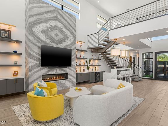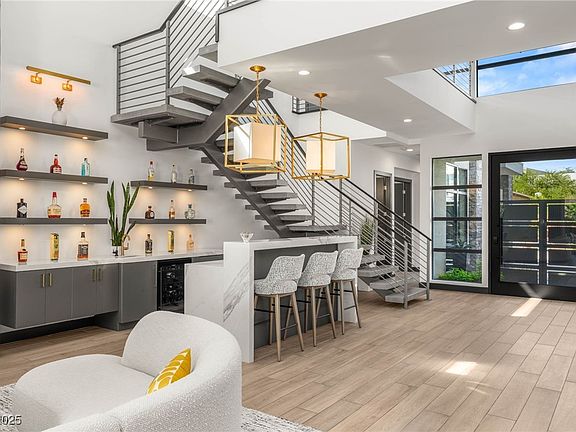 Set behind the coveted gates of Silver Ridge at The Ridges, this residence captures the essence of modern desert living with a soft, sunlit palette and a floorplan designed for seamless flow. Walls of glass frame open living and dining spaces anchored by a gourmet kitchen outfitted with Wolf and Sub-Zero appliances, creating an ideal setting for both everyday living and distinguished entertaining. The main level unveils a serene primary suite with a spa-inspired bath featuring dual water closets and a custom walk-in closet, along with a separate guest retreat, while upstairs each en suite bedroom extends to its own balcony with elevated views. Outside, a pool, spa, outdoor kitchen, and multiple lounge areas create a private oasis for unforgettable evenings beneath the desert sky. Blending architectural precision with effortless elegance, this home delivers a lifestyle of prestige, privacy, and refinement, where modern design meets the allure and sophistication of Las Vegas living.
