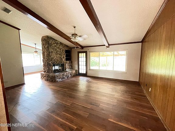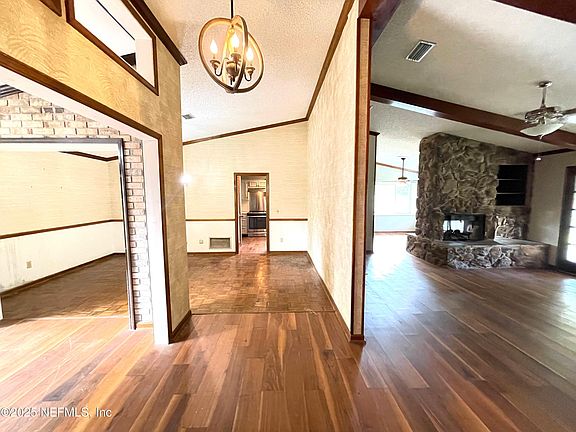 Bring your vision and sweat equity to this solid 4-bedroom, 2.5-bath home offering over 2,200 square feet of potential in one of Mandarin's most desirable neighborhoods. Built with timeless Norwegian brick, this home features soaring vaulted ceilings, beautiful wood beams and accents, and a rare double-sided fireplace that serves as the centerpiece of the living space.