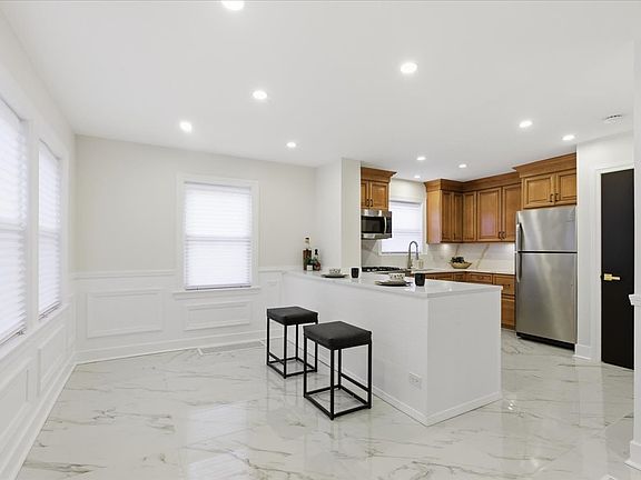 Stately and stylishly reimagined, this 4BR/2BA renovated Georgian commands a corner lot in sought-after West Beverly. Thoughtfully updated for today's buyer, the home blends timeless architecture with modern luxury at every turn. Step inside to a light-filled main level featuring gleaming hardwood floors and elegant wainscoting that elevate the home's classic character. The open-concept living, dining, and kitchen layout is ideal for entertaining, enhanced by oversized windows that flood the space with natural light. The chef's kitchen impresses with Calacatta quartz countertops and backsplash, custom soft closed cabinetry, a stainless steel appliance suite, porcelain tile flooring, and a generous breakfast bar that accommodates four easily. The main level offers two spacious bedrooms-one with a cozy gas-starter free standing fireplace-along with a spa-inspired full bath showcasing a luxury full-body shower tower. Upstairs, retreat to the expansive primary bedroom featuring an electric fireplace, creating a warm and sophisticated sanctuary. An additional bedroom and a second updated full bath with another luxury shower tower complete the upper level. Three of the bedrooms can accommodate queen and king size beds. The finished lower level expands your living space with a large family room highlighted by a second electric fireplace, durable wood laminate flooring, a laundry area with W/D hookup, and plentiful storage. Outside, enjoy dining and relaxation on the brick-paved pergola overlooking the fully fenced yard. A detached 2.5-car garage with lofted storage (via hydraulic pull-down stairs) plus a side driveway offers 2 additional exterior spaces. Perimeter lighting beautifully showcases the home's classic brick exterior. Renowned for its community charm and urban convenience, West Beverly places you minutes from shopping, top-rated schools, parks, and dining. Weekend brunch, afternoon strolls, and everyday errands are all effortlessly within reach. Fall in love-and stay forever. This home is more than move-in ready; it's a true lifestyle upgrade. Perfect for hosting holidays, working remotely, or simply enjoying the comfort of a thoughtfully redesigned space, it seamlessly marries modern amenities with the timeless elegance of its Georgian roots. Come in. Take a look around. You're already home and just in time for Christmas. Start the New Year off in your new home.