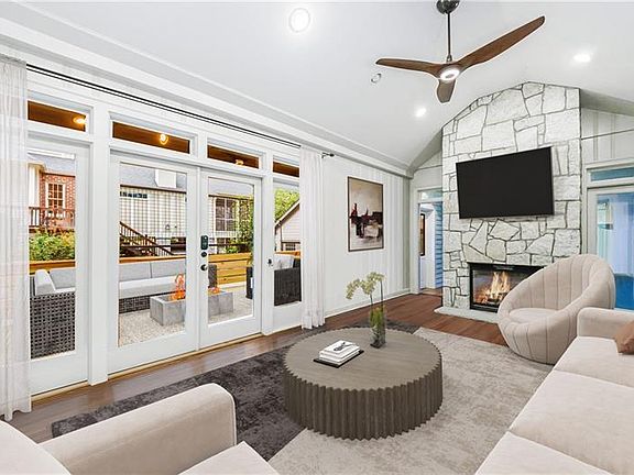 Discover an extraordinary opportunity on one of Morningside's most sought-after streets, nestled in the heart of this vibrant neighborhood! This stunning Tudor-style home, masterfully renovated by John Willis Homes, blends modern elegance with timeless character. Enter through the arched front door into a welcoming living room with a brick fireplace, gleaming hardwood floors, and soaring ceilings, flowing seamlessly into a sophisticated dining room via an elegant arched doorway. Ideal for hosting, the dining room connects to a sunlit sunroom and a pristine white kitchen featuring stone countertops, a farm-style sink, a stainless steel Thermador gas range, a SubZero Refrigerator, and a spacious island. The open-concept kitchen and breakfast area lead to a cozy family room with a vaulted ceiling, floor-to-ceiling stone fireplace, and large windows and doors opening to a generous exterior deck. The adjacent sunroom, with its own fireplace and treetop views, offers a tranquil escape. The expansive primary suite boasts a spa-like bathroom with an oversized shower, clawfoot tub, dual-sink marble vanity, and a custom-designed closet. Two additional main-level bedrooms with beautifully appointed bathrooms provide ample space, while an upstairs loft, bedroom, and full bath create a flexible space perfect for an office, playroom, or gym. Outdoors, enjoy dining on the large deck, which leads to a fenced backyard with a grassy courtyard ideal for recreation. A detached two-car garage and driveway parking add convenience, just seconds from charming shops, restaurants, and parks along tree-lined sidewalks. Modern upgrades include a level 2 car charger, Tesla Wall Connector, and a whole-house generator for added peace of mind.
