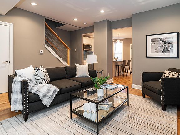 Fantastic renovation with top quality finishes and beautiful open living spaces-this home has so much to offer including a tax abatement through 2027! The floorplan is quite open with handsome wide plank wood flooring, crisp white woodwork and a very neutral décor. The kitchen is all white with quartz countertops and stainless appliances along with a great island for casual dining. Bedrooms are large with lofted ceilings and great closet space and the baths are executed with great style! Other features include 1st floor laundry, large front porch, 1 car garage with additional off-street parking and privacy fenced yard with patio and plenty of room for a dog without being huge! Located within a short distance of some of the best restaurants and brew pubs. See A2A remarks.