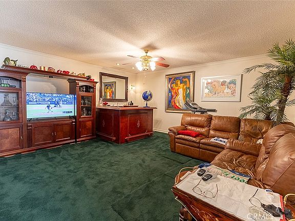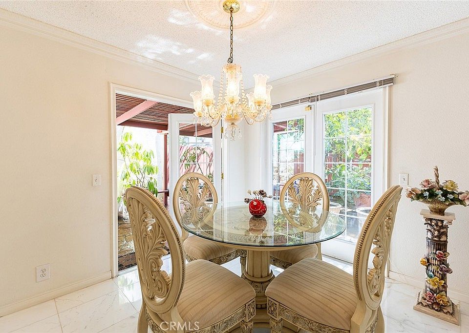 Welcome to 11465 Fox Hollow Lane, a VA Loan Approved Property—a meticulously cared for residence nestled in the desirable California Glen gated with a 24-hour guarded community. This 3-bedroom, 2.5-bath home boasts 1,926 square feet of luxurious living space, offering a refined blend of elegance, comfort, and functionality. You’ll be captivated by its curb appeal and lush trees—all set in a quiet, family-friendly cul-de-sac. Step through the front door and be greeted by sunlight-drenched interiors and Calcutta marble flooring that runs throughout the formal living and dining areas, creating a bright, airy, and opulent atmosphere. The formal living room is adorned with designer mirrors, crown molding, and a white brick fireplace. Just beyond, the dining area showcases a custom Chandelier and two French doors that lead to your private backyard oasis. Back inside, the kitchen is warm and cheerful, featuring white cabinetry, tile countertops, and a large garden window that brings in plenty of natural light. Equipped with a stove, built-in microwave, and ample pantry storage, this kitchen is ideal for the home chef who loves to cook and entertain: a convenient breakfast bar and adjacent dining nook offer casual dining options for busy mornings or intimate evenings. The family room is designed for comfort and entertainment, featuring plush leather seating, built-in cabinetry, and a wet bar with rich, deep mahogany tones and classic, carved detailing on the front panels, showcasing artisan craftsmanship and a vintage appeal. A striking curved staircase with rich wood handrails and classic white balusters, and a grand chandelier that leads upstairs.
