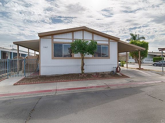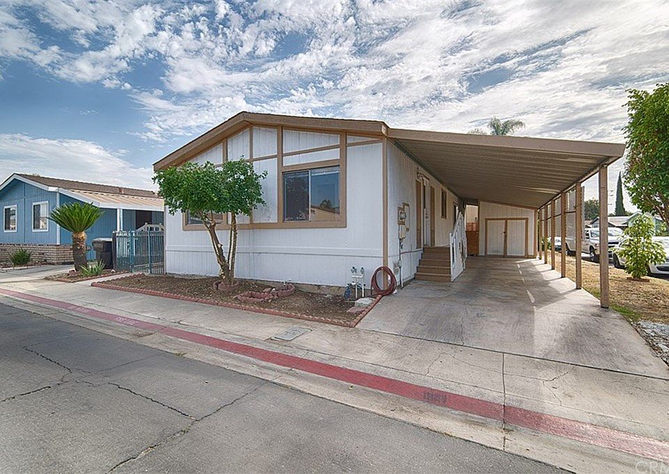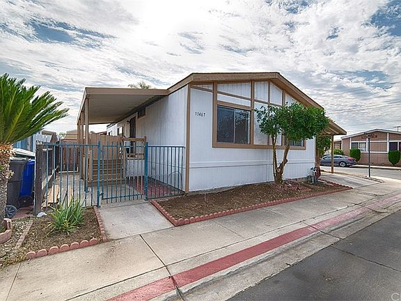 Fantastic Peachwood Community manufactured home with land ownership located on a spacious corner lot. Open and bright floorpan with vaulted ceilings, fresh paint and upgraded wood style flooring and tile throughout. Kitchen features stainless steel oven, range and oversized sink, wood like countertops and clean lined cabinetry with built in dining table. Bathrooms offer upgraded fixtures, vanities, lighting and modern tile flooring. Recently added cement patio with brick wall, electrical outlet, two water spigots, two natural gas lines. Entry stairs recently done in front and back, both in decorative cement. HOA amenities include community park and playground, basketball courts and 24 hour security cameras and patrol. Centrally located with convenient access to 60 and 71 freeways and walking distance to neighborhood schools.