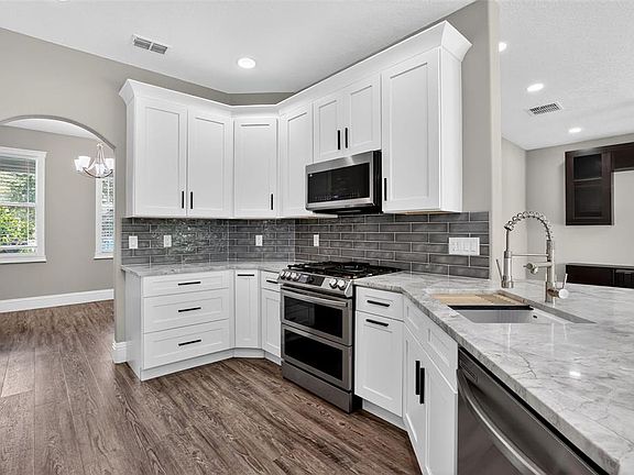 Welcome to this exquisite home in the gated Trinity East Community, where modern luxury & thoughtful design come together in perfect harmony. Priced at $599,000, this gorgeous 2,503 SQFT home offers 4 spacious bedrooms + downstairs office & 3.5 bathrooms, making it an ideal space for family living & entertaining. Built in 2013, this home boasts over $250K in premium renovations, such as LVP throughout the main living areas & porcelain tile in the bathrooms, laundry room & garage. Fresh, neutral paint on the walls, ceilings & trim further enhance the home’s bright inviting atmosphere. Step into the heart of the home, where the fully remodeled, expanded kitchen offers a huge peninsula for ample counter space, new soft-close cabinetry & luxurious Dolomite countertops. High-end Samsung Smart Home Appliances, including wine fridge, make this kitchen a dream for everyday cooking & hosting gatherings. The bathrooms have all been completely remodeled from floor to ceiling. The home also features custom woodworking, such as wainscoting, built-in shelving, 7 1/4" baseboards, & full custom closet system in the primary bedroom, providing both beauty and function. You will find ceiling fans in every bedroom, the living room, & the back patio. The living room also conveys modern floating wall cabinetry, adding a touch of contemporary design. For those who love the finer details, the home is packed with high-end finishes like stone and tile accent walls in multiple areas. The office has custom built-in cabinetry with crown molding, creating the perfect space for work or study. A new chandelier above the staircase, flush-mount LED lights throughout (including the garage), & color-changing LED lights in select rooms enhance the ambiance of the home. Brand new cordless blinds are installed throughout, with plantation shutters in the office. The garage is an organizer's dream, with two overhead storage racks & multiple Kobalt wall rail systems, perfect for keeping everything in its place. The home also features smart home technology that makes everyday living more convenient. With a smart thermostat, rain-sensing sprinkler system, & smart garage door, you can control the home’s environment from anywhere. HVAC system was replaced in 2024. Wired for ADT security & water softener system conveys. The Samsung smart oven also comes with built-in thermometer & air fry mode, adding convenience to your kitchen. Outside, the home continues to impress with custom landscaping that includes a stone garden bed and mature trees. Recent updates to the exterior include a Travertine driveway extension, along with new pavers in the back & side yard which lead out to a firepit area. Tan PVC fencing provides privacy while still offering stunning pond views. Upgraded exterior lighting create a welcoming environment for outdoor living. The home also features hurricane shutters for added protection during storm season. This home also offers access to community amenities that include parks, walking trails, & easy access to local shopping, dining, & top-rated schools. Whether you’re enjoying the comforts of the home’s interior, relaxing in the beautifully landscaped yard, or taking advantage of the advanced smart home features, this property is designed to enhance your lifestyle. With its stunning design, modern upgrades, and exceptional attention to detail, this home is ready to welcome its next owner—contact us today for a private tour!