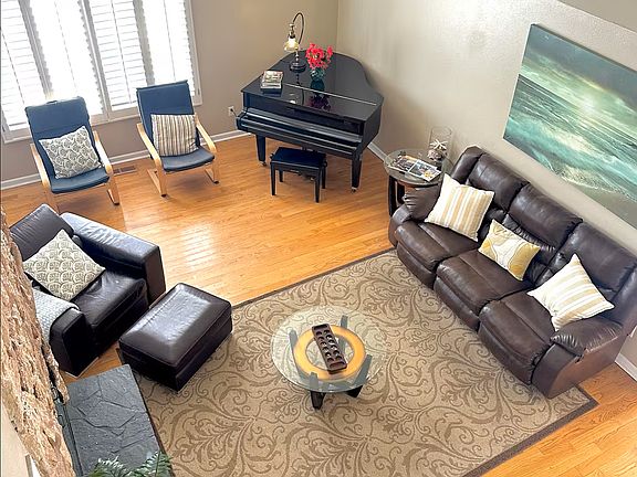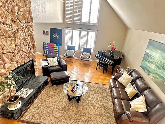 -Magnificent living room with vaulted ceilings, grand piano, and fireplace