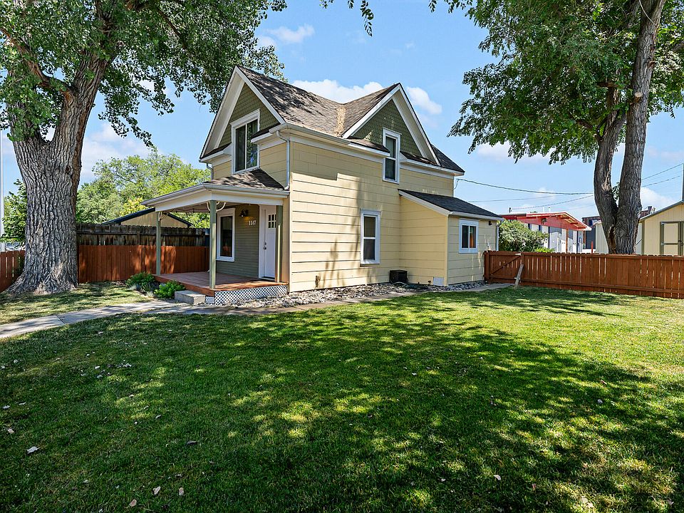 Charming, updated, and ideally located this beautifully restored 2-bedroom, 1.5-bath home at 1147 N Gould St offers the perfect blend of character and convenience just steps from historic downtown Sheridan. Originally built in 1920 and thoughtfully renovated in 2015, this home features modern upgrades throughout, including new electrical, plumbing, roof, furnace, water heater, and windows. Inside, you'll find warm hardwood floors, an open-concept kitchen and living area, ceiling fans, and a walk-in closet. Enjoy outdoor living on the covered front porch or large back deck overlooking a fully fenced yard with alley access, a storage shed, and off-street parking.