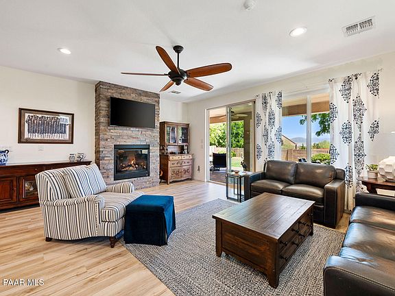 Lovely beautifully upgraded home in Stoneridge in Prescott Valley. Home features 3 bedrooms plus den, 3 bath home with laminate wood floors, Quartz kitchen counters, upgraded appliances, including washer & dryer. Living room features gorgeous stacked rock fireplace and easy access to covered patio and inviting back yard with Bradshaw Mountain view.. Neighborhood features include Community Club House, Pool, Tennis courts and parks.