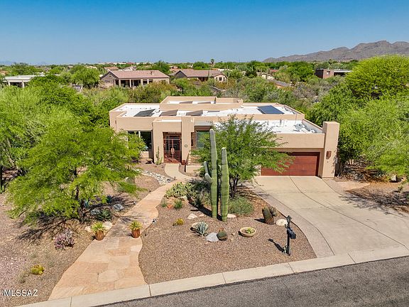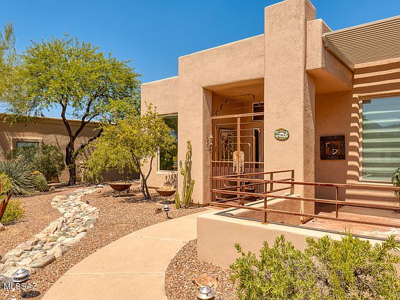 Well appointed property located in desirable Oro Valley community of Desert Vista on a large .70 acre lot. This 3 BD/2 BA/2,638 Sq.Ft home offers an inviting foyer, formal living area/den, formal dining room w/coffered ceilings & great room concept family room. Gourmet chef's kitchen features granite counters, beautiful cabinets w/pulls, island w/sink & breakfast bar, breakfast nook, SS appliances w/new oven & microwave & walk-in pantry. Primary suite has patio access w/sliding glass doors, updated bath w/jetted tub, tiled walk-in shower, separate dual vanities & walk-in closet. Guest bedrooms have added mini-split AC units & east guest bedroom has patio access to backyard. Backyard is a true oasis w/large covered patio, sparkling pool, Outdoor BBQ, fireplace, 2 ramada sitting areas (MORE ...., lush landscaping & privacy w/common area behind home. Seller added an owned solar system for lower electric bills. Garage has copper garage door, cabinets, utility sink & extended area that's great for storage