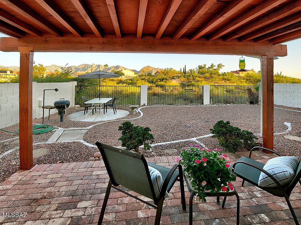 ADORABLE 2 BR/ 2 BA TILE ROOFED, ONE STORY COPPER CREEK HOME ON A FABULOUS EAST FACING LOT BACKING NATURAL AREA AND WASH WITH UNOBSTRUCTED CATALINA VIEWS! HOME BOASTS A SPACIOUS LIVING/ DINING ROOM, COZY KITCHEN W/ NOOK, BREAKFAST BAR AND UPDATED APPLIANCES, TILE AND WOOD FLOORING (NO CARPET), MANY CEILING FANS, FRESH PAINT INSIDE AND OUT, 2 CAR CARAGE WITH SINK AND LOTS OF STORAGE CABINETS, OUTSIDE DISTRESSED BRICK PAVERS AND SHADY COVERED PATIO WITH INCREDIBLE MOUNTAIN VIEWS! HVAC REPLACED IN 2018 AND ENTIRE HOME WAS REPLUMBED IN 2023. LOWEST PRICED SINGLE-FAMILY HOME IN ORO VALLEY!