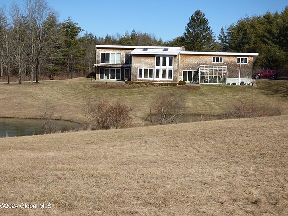 A rare opportunity awaits a buyer of this unique Custom Contemporary home on 71+ acres adjoining the Maple Hill Schools. Offers complete privacy with a long driveway that is covered by trees forming a canopy to drive through. There are miles of groomed trails and 2 stocked ponds directly behind the home - ideal for horses, other farm animals/pets, four-wheeling, hunting or any outdoor activities. Has a greenhouse attached to the home with an adjoining tiled room for plant prep. There are 2 oversized attached garages one at each end of the house - which offers ample storage space. Home is an entertaining dream with huge dining room overlooking the ponds and 2 walls primarily windows with sliders to a brick patio. 2 wood burning fireplaces. Likely has 2 building lots on Maple Hill Rd.