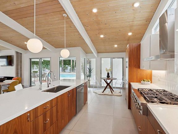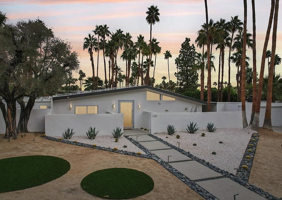 Mid-century stunner in Vista Las Palmas! Positioned for the greatest views in VLP on acclaimed Rose Avenue, this Alexander has it all. Situated for immediate enjoyment with designer finishes and all the work is done so you can enjoy! Tile flooring, walnut cabinetry, recessed lighting, tongue and groove ceilings, all windows and glass, bathrooms, doors, roof, smooth coat stucco, paint, A/C, tankless water heater, and electrical panel... everything is new! Enter through a custom pivot front door. Kitchen features professional Kitchen Aide appliances, and a paneled Dacor refrigerator, walnut cabinets and pantry, quartz counters, designer backsplash, and perfectly configured open, peninsula layout. Living room offers walls of glass, new sliding doors and tiled, original Alexander fireplace. All bedrooms are en suite with oversized, designer tiled, showers, floating vanities, and designer light fixtures. Primary suite offers and oversized bedrooms with pendant lights on either side of the bed, dual heads in the shower with shower wands, freestanding soaking tub, dual vanities, and access to the backyard. Resort style back yard offers newly designed, plastered, and tiled pool/spa with new acid washed concrete decking. Built in bbq with concrete countertops, covered patio, built in fire pit and huge mountain views in every direction. This VLP stunner is an excellent investment property, second home or primary. Renovation completed in 2023.