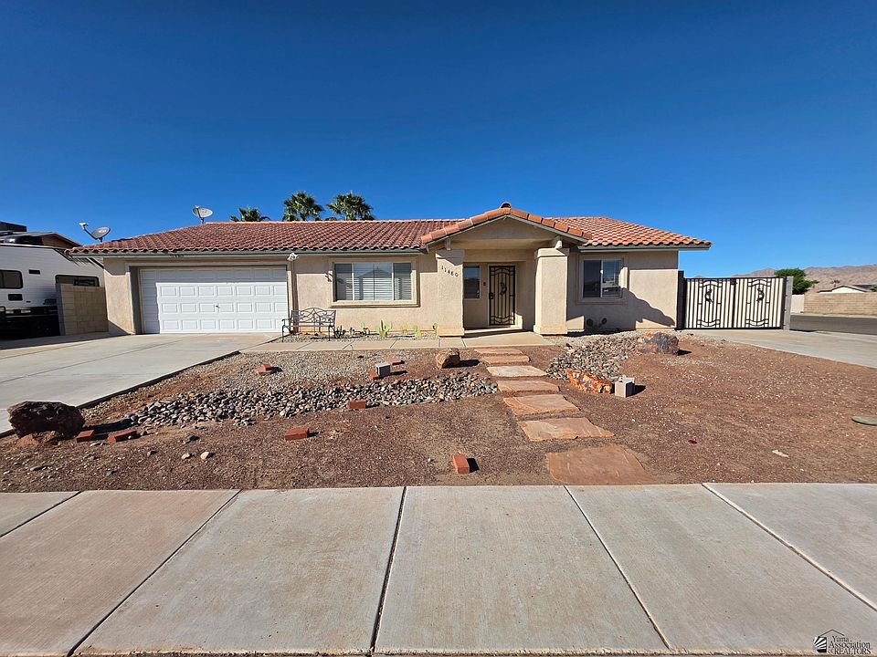 Corner lotDesert landscapingBreakfast barTile roofHuge walk-in pantryGranite countertopsWood laminate flooring