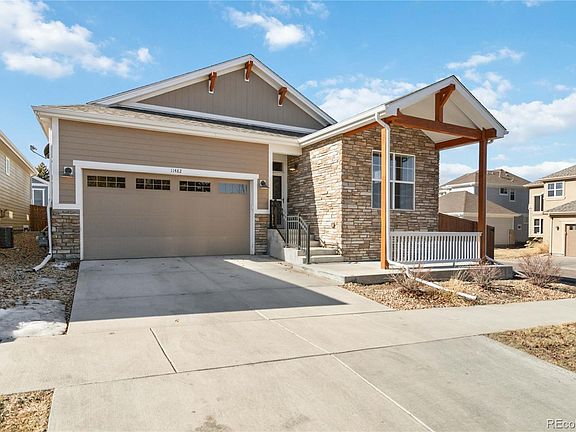 Nestled in Lincoln Creek Village, this corner lot ranch is a must see! This house boasts a high-end open floor concept with vaulted ceilings and oversized windows that provide excellent sun exposure. The Kitchen includes granite countertops with island and a walk-in pantry. The kitchen cabinets have been customized with roll out shelving and under cabinet lighting. This Colony loop home has 4 bedrooms and a fully finished basement. The bright primary suite faces west and includes an ensuite and spacious walk-in closet. Carpet on the main floor recently updated. The ensuite has granite countertops with double sinks and a walk-in shower. Enjoy the cozy yet spacious living room with gas fireplace and multiple windows. The beautiful oversized finished basement is perfect for entertaining. The custom-built entertainment center has hidden wiring and TV mount and fits a 70” flat screen tv. There is substantial space in the basement for seasonal storage. The 4th bedroom with double door closet is the perfect office space or quiet getaway. Google smart light switches and doorbell make it easy to monitor your home while enjoying a night on the town in downtown Parker. Take advantage of a low maintenance lifestyle while the HOA takes care of front yard maintenance and snow removal. The 2-car garage is wired for an electric vehicle. Adopting the bungalow style design, the covered front and back patios are perfect for watching the sun rise and sun set. Make sure to tell your insurance agent that the a new roof was installed, and fence freshly stained in 2024. Close to hwys, schools, parks, and minutes away from Mainstreet, this is a move-in ready property and perfect for a family or retired couple. Virtual tour available.