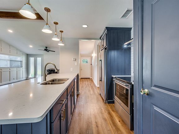 For Lease in Northwest Dallas. Three bedrooms, two full bathrooms, two car garage, fenced backyard. Kitchen and baths were updated in 2020 with modern touches. Primary bedroom has walk-in closet and ensuite bath with double sinks, a glass and tile shower, and full size washer, dryer utility closet. Second bath features a tub, shower combo. White blinds throughout the home feel bright and crisp. Kitchen offers Maytag stainless steel appliances, white quartz countertops, pendant lighting, recessed lighting. Range is electric. Living and dining areas combine to offer flexibility. Brick fireplace. 2025-09-19