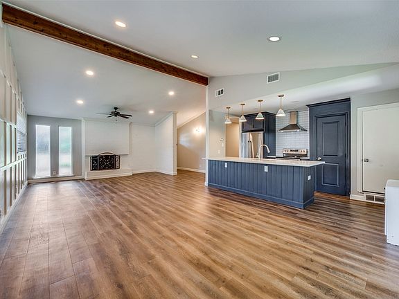 Brick fireplaceModern touchesRecessed lightingMaytag stainless steel appliancesWhite blindsWhite quartz countertopsPendant lighting