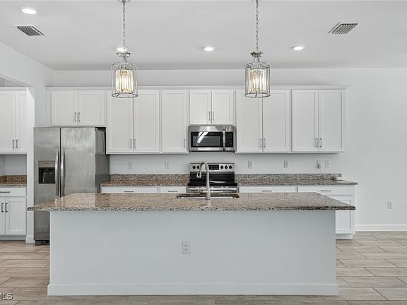 Take a look at what could be your new home at Timber Creek in Fort Myers! This 2-story Sorrento model gives you 5 bedrooms, 4.5 bathrooms, 3,357 square feet of living space, and a 3-car garage with epoxy flooring. Walk in through your front porch and the first thing you'll notice is that inside boasts an open concept floor plan that flows together seamlessly. This downstairs area has your living room, kitchen/ dining rooms, a laundry room, one en-suite bedroom that also leads to the lanai, and a powder room. Features lining those rooms include updated ceiling fixtures, granite countertops, an oversized island, white cabinetry, stainless steel appliances, diagonally laid tile in the main areas and cozy carpet in the bedroom. On this first level you also have your screened-in lanai with plenty of room to build your own custom pool & spa! Upstairs on the second floor, is your large loft area, three guest bedrooms, and a massive owner’s suite with his and her walk-in closets, two bathroom vanities, and a beautifully tiled walk-in shower. This home is meticulously maintained and ready for you to enjoy with friends and family! As a resident of Timber Creek, you have endless amenities to enjoy outside of your new home. Those include a resort-style pool w/ hot tub, a lap pool, state-of-the-art fitness center, an indoor/outdoor restaurant and bar, play area, sauna, basketball, pickleball courts, tennis, putting green, and more! Living at Timber Creek is more than just residing - it's a lifestyle. Your neighbors are waiting! Come check out what the Timber Creek lifestyle is all about!