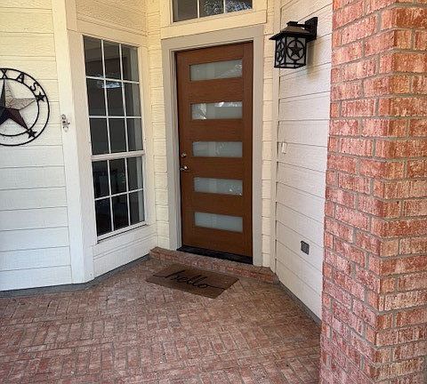 Tastefully updated with a fresh and modern look, this maintenance free, move in ready home, in the highly desirable Lakes of Preston Vineyard features a spacious, open living area with custom floor to ceiling wall art display over the updated gas fireplace. A brand new, sliding door has been added to the Den or Study space at the front of the house for privacy. The kitchen boasts a wonderfully modern butcher block island with room for seating, as well as plentiful storage, and includes and a new gas cooktop, electric oven, and a built in microwave and refrigerator. The open dining area flows into the kitchen and living area. The private primary suite has a custom closet system, and the updated primary bathroom has a new shower, bathtub, sinks and related hardware. The secondary bedroom was expanded and features a great walk in closet. The secondary bathroom has ample storage and has been completely updated with a new sink and a new walk in shower and fixtures. The separate laundry room includes a washer and dryer. The backyard feature a large patio and a board on board privacy fence, where you can privately enjoy gardening or other hobbies. New flooring throughout. Roof was replaced in 2015 and the, HVAC system was replaced in 2017. Oversized 2 car garage.