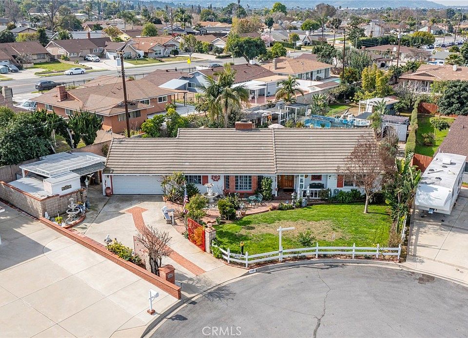 This charming home is tucked away in a peaceful cul-de-sac in the heart of West Covina. Behind the large iron gate on the left, you'll find a generous space in front of the garage perfect for accommodating multiple family cars. Inside, the popular three-bedroom, two-bath layout offers both comfort and functionality, enhanced by newer double-paned windows throughout. The spacious living room offers a warm welcome, while the kitchen conveniently opens to both the dining area and a cozy breakfast nook. A large family room flows seamlessly into a bright sunroom (extra space not included in the listed size) ideal for a home office, playroom, or entertainment space. The master bedroom opens onto a wide patio that extends into the expansive backyard. Set on a flat 14,743-square-foot lot, the property is filled with abundant fruit trees, making the outdoor space truly special. Conveniently located near the 10 Freeway, shopping centers, highly rated schools, and a variety of restaurants, this is a must-see home that offers both tranquility and everyday convenience.