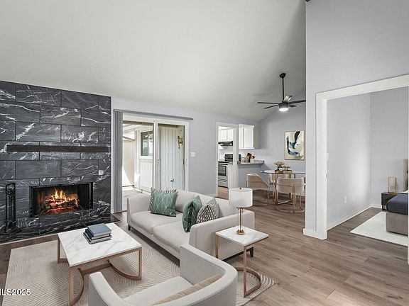 Beautifully updated 3 bedroom, 2bathroom townhome offering over 1100 sq. ft with two separate courtyards in desirable Northwest Reno. Surrounded by a lush, park-like setting maintained by the HOA, this community provides full exterior maintenance including the roof, siding, and paint. Residents also enjoy resort-style amenities with two sparkling pools and a clubhouse. Inside, the home has been extensively remodeled with over 60,000 dollars in improvements. Upgrades include waterproof laminate flooring throughout, fresh interior paint on walls, ceilings, and trim, and a new Italian marble fireplace replacing the original faux stone. The kitchen features refurbished cabinets with new hardware, updated lighting, and a remodeled recessed light area. Additional features include new windows and sliding doors, custom cellular window shades, ceiling fans in the bedrooms and dining area, and a fully remodeled laundry space with tile flooring and a new front-loading washer and dryer. Bathrooms have been updated with new vanities, toilets, and medicine cabinets. The home also includes built-ins and new doors in all closets, new baseboards and trim, a dog door, rain gutters in the front and back courtyards, garage shelving, new electrical outlets with USB ports, a new dishwasher and stove/oven, and popcorn ceiling removal throughout. This move-in ready home offers style, comfort, and low-maintenance living in one of Northwest Reno's most peaceful community