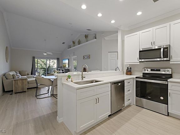 Discover modern Florida living in this like-new 3 bedroom, 2 bathroom condo located in a desirable gated community filled with resort-style amenities. This beautifully maintained second-floor unit includes a private garage and a screened lanai, offering comfort, style, and peace of mind, all in a no flood zone. Inside, you'll find tile flooring throughout, LED lighting, and elegant crown molding that enhance the home's bright, open layout. The kitchen features white shaker-style cabinets, quartz countertops, and stainless steel appliances, perfect for cooking, entertaining, and everyday living. Both bathrooms offer matching modern cabinetry and quartz surfaces for a cohesive, high-end look. Enjoy the privacy and security of a gated, amenity-rich community, complete with a clubhouse, fitness center, pool, and more. Conveniently located near shopping, dining, and top local attractions, this condo combines luxury and location in one incredible package. Whether you're looking for a primary residence, seasonal getaway, or investment property, this move-in ready condo has it all. Schedule your private showing today and experience the best of Florida condo living!