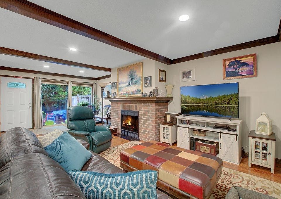 Welcoming town home with open floor plan, solid wood floors, skylight, Pella windows, fireplace & beams in LR, and large patio doors on both ends that create a great breezeway. 4 large bedrooms - 2 up and 2 down âbalcony off the upper level master & patio door in lower level BR allow access to private, luscious backyard views. Finished walk-out basement with spacious family room, 2 BRs and large bath w/lovely tiled shower. Lovingly cared for with lots of updates including complete kitchen & main level bath remodel in 2019, water heater in 2018, clothes dryer in 2018, reinsulated attic in 2015, windows in 2014, A/C unit in 2011, and garage floor relaid in 2013. Enjoy the privacy & beautiful gardens in the front patio, quiet and private road, and walking distance to Silverwood park. Small development tucked away in the woods. All this in the Mounds View School Districtâ¦just move right in!