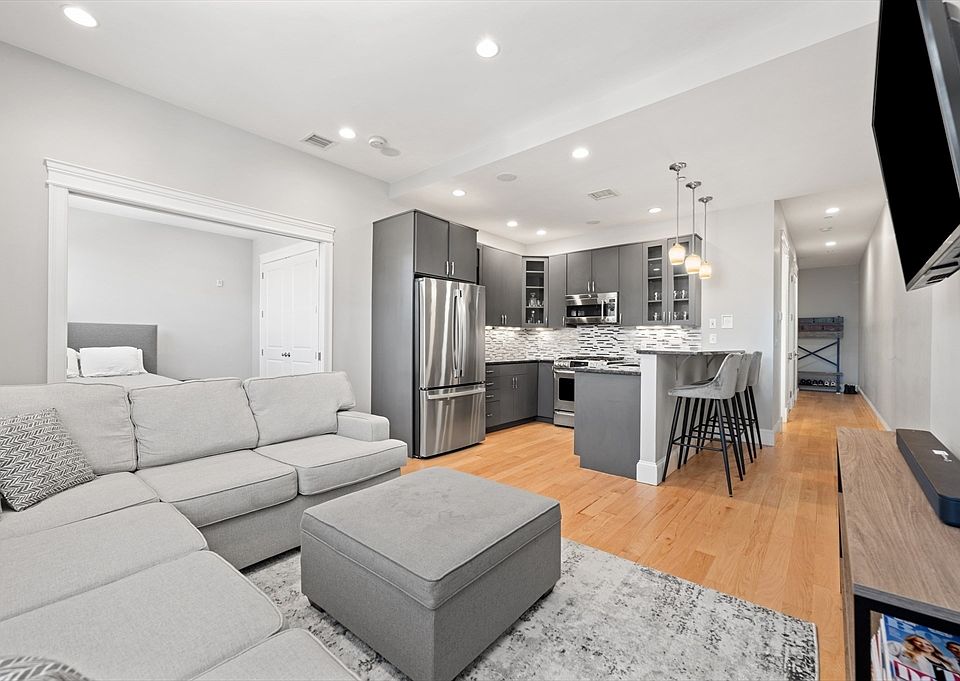 This sun-filled home features soaring ceilings, gleaming hardwood floors, and oversized windows that flood the space with natural light. Versatile sliding pocket doors create flexible options for privacy, entertaining, or open living. The kitchen features modern cabinetry, stainless steel appliances, a stylish backsplash, and granite countertops. The king-sized primary bedroom offers an en-suite bath, while the second bedroom comfortably fits a queen bed and includes generous closet space. Enjoy the convenience of in-unit laundry, central A/C, deeded storage, and one heated garage parking space. A prime location just two blocks from the Broadway T Station, with easy access to acclaimed restaurants, Seaport, Downtown, South End, highways, and the airport.