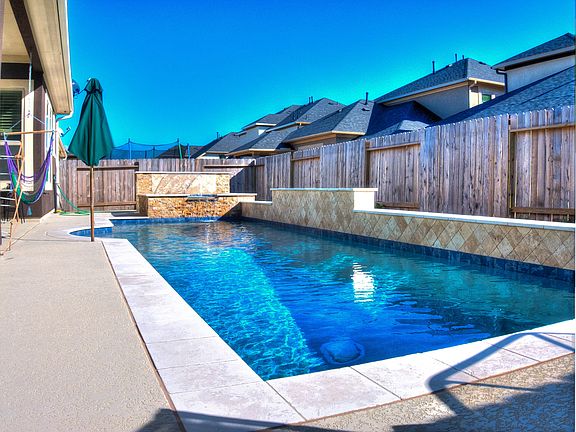 Fabulous family home in Tuscany Woods in Shenandoah (close/easy access to I-45) with spectacular pool! Beautiful stone and stucco home with 5 bedrooms and 3.5 baths. Hand-distressed wood floors and travertine. Study with French doors. Formal dining room. Spacious family room with wood floors adjoins kitchen. Kitchen has island with raised bar for serving/dining, granite counters, linear mosaic backsplash, stainless steel appliances, 6-burner gas cooktop, travertine floors, and wine/coffee bar. Laundry room has utility sink, folding counter, and room for 2nd refrigerator. Master suite has tray ceiling, double crown molding. Master bath has his and her vanities, granite, jetted tub, glass enclosed walk-in shower, mosaic accent tile, travertine, bronze fixtures. Upstairs is game room with 4 secondary bedrooms and 2 full baths (one Jack & Jill). Stunning linear rectangular pool with raised spa and multiple waterfalls. Lanai with ceiling fan has room for dining table or lounge furniture.