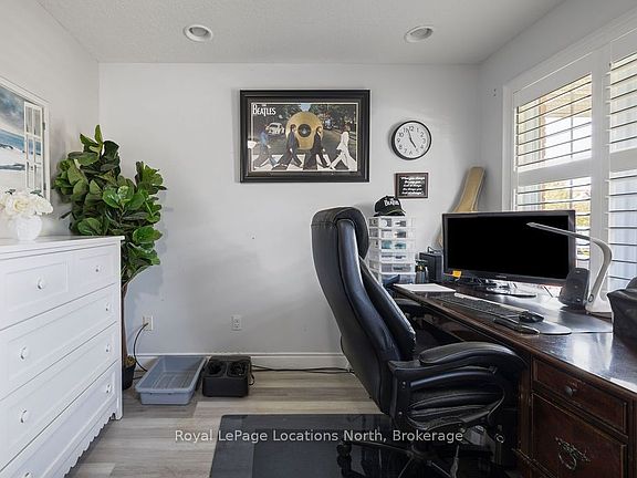 Backyard Beautiful Pool backing onto woods with Georgian Trail nearby - Welcome 115 Chamberlain Crescent, ideally situated in a sought-after neighbourhood backing on to nature's forest complete with cardinals, blue jays and more! A well built Devonleigh home, the property offers a rare opportunity to enjoy privacy, nature, and outdoor living right from your backyard while still being close to schools, shopping, and everyday amenities.The main floor is warm and inviting, designed with pot lights throughout and a gas fireplace that creates a cozy living space. The kitchen has been refreshed with new countertops, a modern glass backsplash, and all stainless steel appliances. The dining area features a walkout to the back deck that makes barbecuing and entertaining easy. At the front of the home, a bright office overlooks the street and beautiful gardens, offering plenty of natural light and the perfect spot for working from home. This level is completed by a convenient 2-piece bathroom and inside entry from the 1.5-car garage for everyday ease. Upstairs, you'll find all three bedrooms together, complemented by California shutters. The primary bedroom offers a walk-in closet and ensuite. The finished lower level adds plenty of additional living space, complete with a second gas fireplace, laundry area, and room for family activities or entertaining guests.The backyard is fully fenced and tailored for outdoor enjoyment, complete with a beautiful three-year-old above-ground heated pool, perfect for making the most of summer days. An irrigation system keeps the lawn lush and green, while the generous yard provides plenty of space for entertaining or relaxing. At the front, parking is available for three to four vehicles. Backing directly onto trails and green space, with a park down the street. Minutes from downtown Collingwood + the ski hills at Blue Mountain. Couldn't find a better location to start your relaxed lifestyle in Collingwood!
