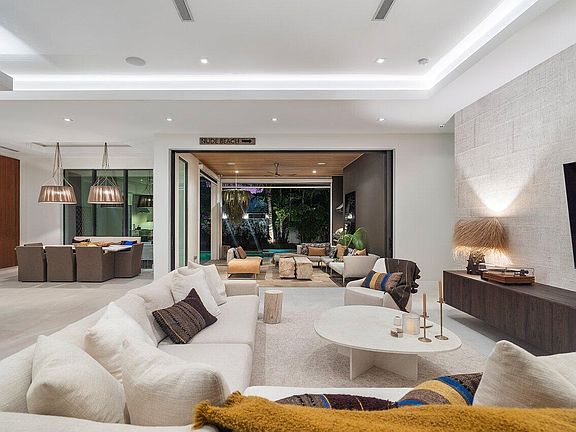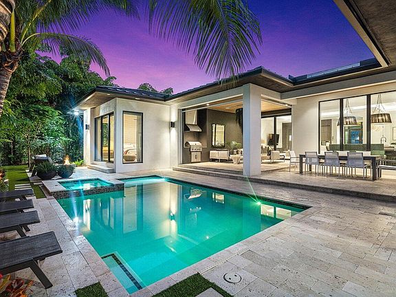 Welcome to this stunning California Contemporary home in Delray Beach! This designer showcase is meticulously designed, blending modern style with warm lines. It epitomizes sophisticated yet casual living and seamlessly integrates the indoor-outdoor lifestyle.Step inside and be captivated by the airy, open concept living spaces. The architectural elements, such as volume ceilings and walls of glass, invite an abundance of natural light, highlighting the fine features and finishes throughout the 4 bedroom, 3 bath home. Built by esteemed Marc Julien Homes and elevated by Vee Merklen's impeccable interiors, this residence is sure to impress at every turn.The attention to detail is evident in the upgraded lighting fixtures and designer wallpaper accent walls that add depth & texture and warmth to the already stunning home. Porcelain flooring in the main living areas and Brazilian walnut flooring in all the bedrooms offer a touch of luxury.