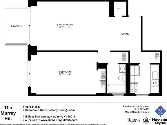 Renovated spacious one-bedroom touts a private balcony, great light and open views. This is the largest one-bedroom line in the building. A spacious dining area off the galley kitchen has custom solid wood cabinetry, stainless steel appliances, and granite countertops.The living room is large enough to flex to a two- bedroom. In addition, this home comes with abundant closet space. A 24-hour doorman building, The Murray Hill has a fantastic staff with Resident Manager, a landscaped and furnished roof deck, and laundry in the building. Complimentary amenity package offers membership to fully-equipped fitness center, tenant lounge and bicycle storage.