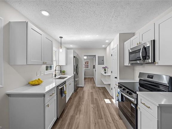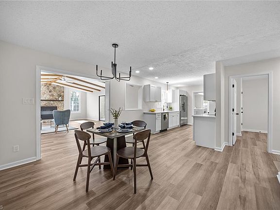 Lovely Graham remodel with attention to detail! This stylish ranch has been updated with upscale finishes and modern details. The heart of the home is the designer kitchen that showcases sparkling quartz countertops, all-wood soft-close cabinetry, and new stainless steel appliances. New designer light fixtures, ceiling fans, and hardware match well with new luxury vinyl plank flooring and fresh paint throughout the home. Both bathrooms feature new vanities, toilets, tubs, mirrors, and fixtures. Step from the dining room into a charming living room with vaulted ceilings and a sleek remote controlled fireplace. The quarter acre spacious yard is great for hosting and the small koi pond offers a unique touch on the back concrete patio. Additional high-value upgrades include a 2025 HVAC system and a metal roof. Don't miss your opportunity to make this property yours!