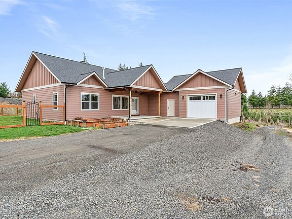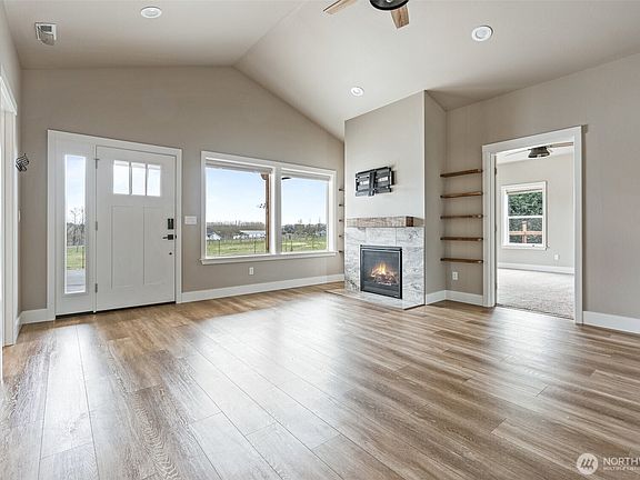 Custom built rambler, completed in 2022, offering a perfect blend of comfort and modern design. This thoughtfully designed home includes stylish finishes such as stone countertops, durable LVP flooring, stainless steel appliances, and a tankless water heater. The vaulted, open-concept great room is warmed by a propane fireplace, creating a cozy yet airy atmosphere. The spacious primary bedroom features a generous walk-in closet and an attached ¾ bath with an oversized shower. A second bedroom also includes its own private ¾ bath. Outside, an RV pad with full hookups. Don’t forget the extra-large single-car garage with plenty of storage. Enjoy the peace and serenity of country living, yet just 6 miles from I-5 for easy access for commuting.