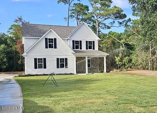 Discover the comfort and tranquility of this delightful NEW custom-built home, situated on a .46-acre lot in Belle Cove Estates! An abundance of natural light enhances the spacious open-concept main level. At the heart of the home, the family room features a cozy fireplace, creating an inviting atmosphere for relaxing and making memories. The appeal of this home is further accentuated by its kitchen, boasting functionality and style, equipped with granite countertops, stainless-steel appliances, kitchen island, pantry, and plenty of beautiful cabinetry. A breakfast nook, formal dining, and spacious bedrooms provide ample space for guests to gather and is perfect for entertaining. The primary suite serves as a restful retreat, generously sized and complete with a sleek tiled shower and large walk-in closet, blending comfort with convenience. Storage is plentiful throughout with a walk-in attic space. With durable vinyl siding and beautiful stone veneer, the home's exterior is both attractive and low maintenance. The sizeable double garage offers plenty of room for vehicles and essentials, adding to the home's practicality. Surrounded by a wooded backyard with a charming back deck, it's the ideal setting for quiet mornings and serene evenings. The location of this home is an ideal mix of quiet living and convenience. Just a short drive to local dining and shopping, Crystal Coast beaches, area bases, top-rated schools, and medical facilities.