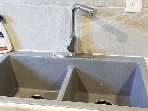 *Modern Kitchen New Cabinets Pulls, Deco Shelving, Modern Faucet, Walk In Pantry Landlord Provides Large Shelving Unit