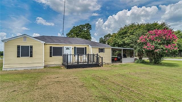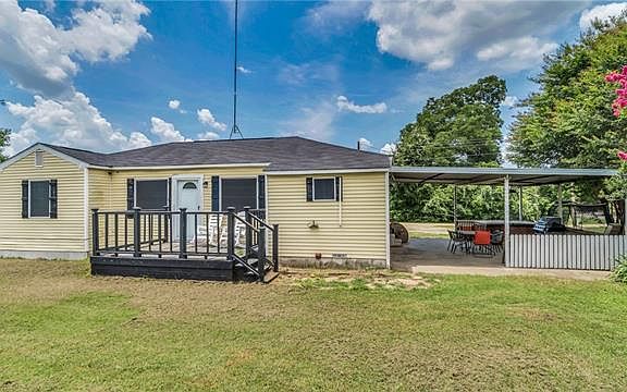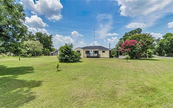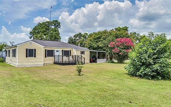 Nice 2 bedroom, 1 and a half bathroom home on a beautiful 1 acre + or - corner lot, with some large pecan trees, deck, and plenty of carport spaces. The dining area opens into the living and kitchen areas. Sliding spice rack, and storage in the kitchen cabinets. Also, a breakfast bar in the kitchen. There is hot tub on the covered patio, and plenty of work space under the carports.