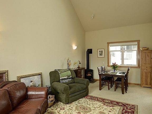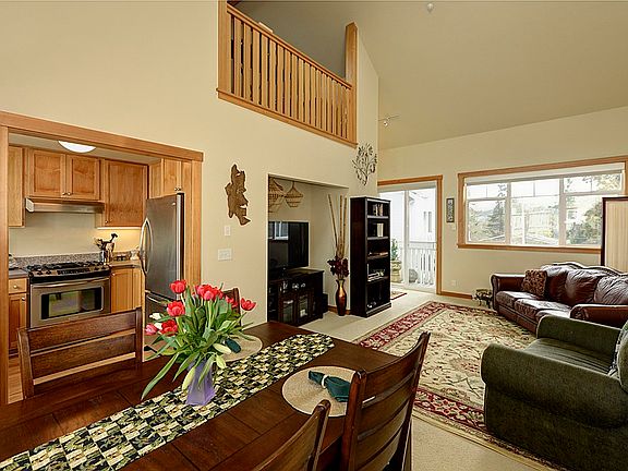 Former model home, this gorgeous bright Madrone Village town home offers some of the finest attributes in the community. 18' tall cathedral ceilings in the living/dining area, skylights (the one in the loft opens for whole house ventilation) & walls of glass offering sunny south facing views of Captain Wilkes courtyard/fountain & Winslow Way and north facing village views. The main floor offers 2 bedrooms and 1.5 baths, plus the home includes upstairs loft/office and a garage. Ideal! interior fresh paint - bright and clean!