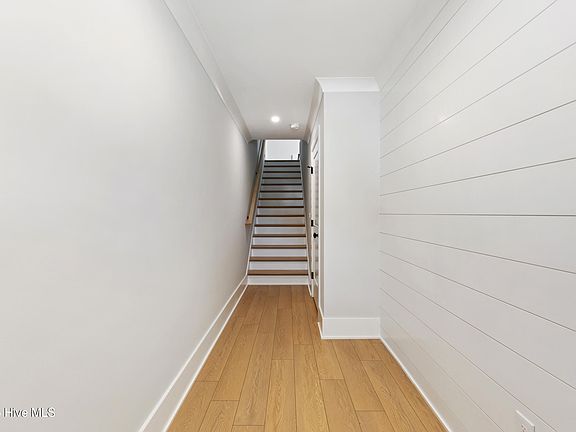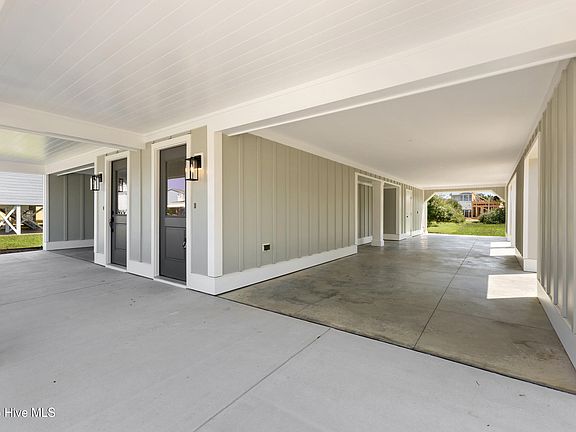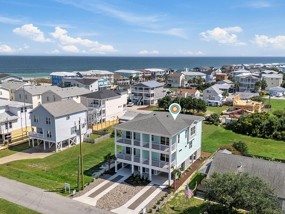 Welcome to coastal living at its finest in this stunning new-construction townhome just steps from the beach in desirable Kure Beach. With 1,960 sq ft, this 3-bedroom, 2.5-bath home offers luxury and convenience. The ground level features covered parking for 3 vehicles, 2 driveway spaces, a private garage storage room, and an outdoor shower. Inside, a conditioned foyer with closet leads upstairs to the main living areas. The first floor hosts all bedrooms, including a tranquil primary suite with private waterproof Red Balau wood deck, custom walk-in closet, and spa-like bath with tiled walk-in shower, quartz countertops, and chrome finishes. Two spacious guest rooms offer ample storage and fit queen and king beds. A second full bath features a tiled tub surround. The walk-in laundry room includes a large-capacity smart GE washer and dryer — a rare new-build feature. Upstairs, enjoy an open-concept layout with 10-ft tray ceilings, a large living area, and a 10x14 dining room ideal for entertaining. The gourmet kitchen features quartz counters, stainless GE appliances (5-burner range, microwave, French-door fridge), and chrome finishes. A second covered Red Balau wood deck with privacy wall offers the perfect spot to relax in the ocean air. Interior highlights include Shaw Polaris LVP flooring and a soft Benjamin Moore gray palette. Built for quality and low maintenance, the home includes Hardie Plank siding, impact glass windows, and 40-year architectural shingles. Dual HVAC units offer energy-efficient comfort. With no HOA dues, no short-term rental restrictions, and located outside the flood zone, this home is perfect for full-time living, a vacation getaway, or investment. Don't miss this rare opportunity in Kure Beach — schedule your showing today!