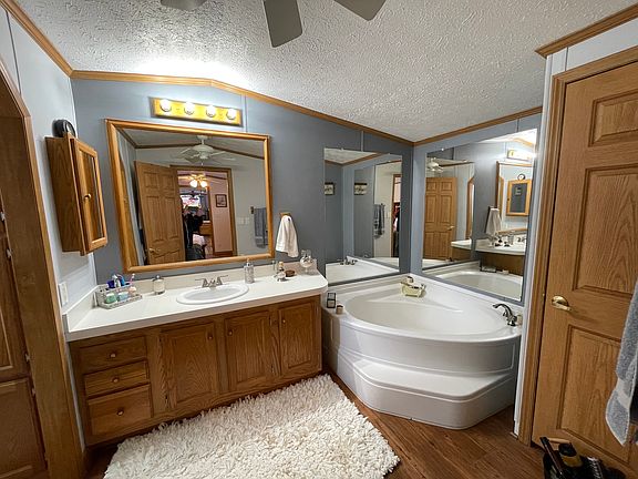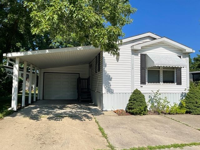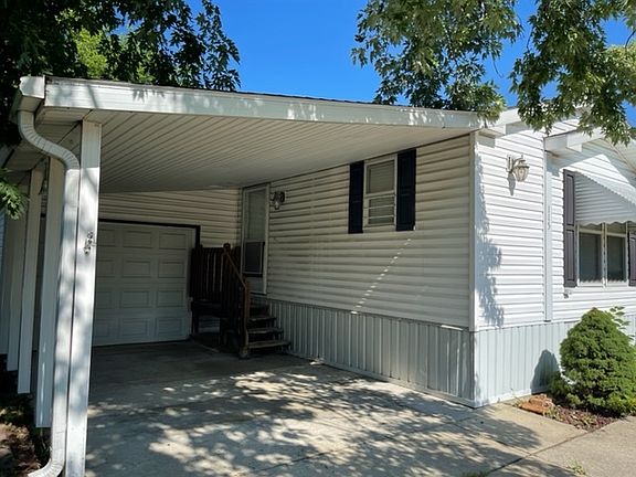 First deal fell apart now back on the market for a lucky buyer. Late model 2002 Schult 15'X69' single wide with a huge attached and drywall finished garage 14'X30' with heater plus a covered carport and front entrance. Most homes in Timber Ridge span 2 decades and are from 1970-1989 (aluminum siding) so this is 2 decades newer and does not have aluminum siding but rather vinyl siding. Big double shed in the rear and a patio. Awning and double dormer in the front of the home. Gas fireplace in the living room with a corner hutch. All appliances stay including a new dryer and washer. Eat-in kitchen with all of the appliances. Home has been painted in neutral colors and new flooring installed with base trim. New toilets and some light fixtures are newer. Must be approved by Timber Ridge. This home has a garage, carport, plus parking for 2 cars in front.