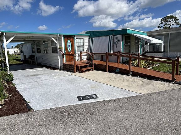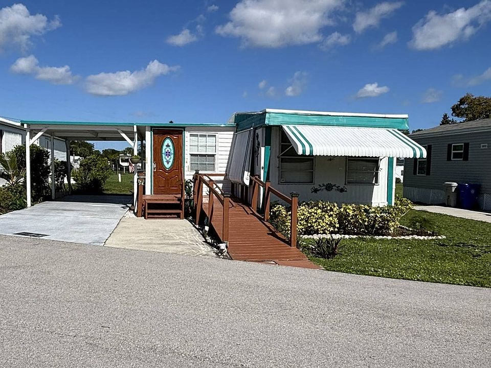 Discover this inviting 1971 home, thoughtfully designed for accessibility and comfort. Featuring a convenient exterior ramp, this residence boasts a spacious 8.5′ x 45′ sunroom addition, seamlessly connecting a cozy living room and a dedicated laundry/storage room. The home comes partially furnished, ready for your personal touch. Enjoy a bright white kitchen, perfect for culinary enthusiasts, complemented by a one-year-old hot water heater for efficiency. Accordion hurricane shutters adorn all windows, ensuring safety and peace of mind. The property includes a long carport and a utility shed, ideal for additional storage. Nestled on a beautifully landscaped lot with no homes behind, this home offers privacy and tranquility. Stay comfortable year-round with central air conditioning. The expansive main bedroom features a large walk-in closet, providing ample storage space. Don't miss this opportunity to own a well-maintained, accessible home with modern upgrades and a serene setting. Schedule a viewing today! Whispering Palms Resort is a vibrant 55+ age-qualified active pet-friendly community just minutes from Wabasso Beach and downtown Sebastian. Amenities include two heated pools with water exercise classes, tennis and pickleball courts, shuffleboard, horseshoes, pétanque, a dog park, game room, and a community thrift store. Social activities such as bingo, ice cream socials, dinner gatherings, and hobby groups make this an active, welcoming Florida lifestyle. Lot Rent is Only $790 per month which includes weekly trash and recycling pickup. Homeowners are responsible for their lawn care and ALL Utilities. Each person living in the home must be approved by the office prior to purchasing the home. The Perfect Retirement Destination!