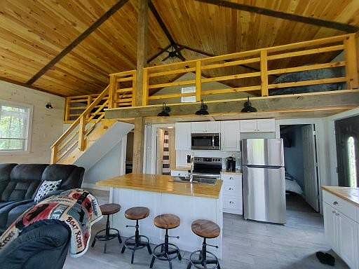 Welcome to this beautifully constructed year-round residence, built in 2021 and perfectly situated on a quiet cove of East Caroga Lake. Offering 75 feet of direct waterfront and set on an oversized, private lot (100' x 198'), this property is ideal as a primary home, retirement retreat, or four-season vacation getaway. The home features low-maintenance, durable cedar siding and is well-insulated for comfort in every season. Inside, the expansive great room impresses with soaring ceilings, an open floor plan, and a stunning stone mantel with an electric fireplace insert. The space seamlessly integrates the kitchen, dining, and living areas - perfect for both everyday living and entertaining. The main level includes two well-appointed bedrooms, one with an adjoining half bath. Both bedrooms offer ample closet space and are complemented by attractive, easy-care tile flooring throughout. Upstairs, a spacious 27-foot loft provides additional sleeping quarters or flexible living space. Property Highlights: • Built in 2021 with quality materials and craftsmanship • 75 feet of lakefront with private dock • Oversized lot: 100' x 198' • Two-car detached garage with overhead storage • Propane-fired forced hot air heating system • Drilled well and private septic system • 200-amp electric service • Tile flooring throughout main level • Stone fireplace mantel with electric insert • Expansive loft for additional living or guest space Enjoy all that the Caroga Lake region has to offer, including direct boating access to both East and West Caroga Lakes. The lakes are regularly stocked for excellent fishing. In the warmer months, residents enjoy swimming, kayaking, biking, hiking, golfing, and local live music events. Winter brings snowmobiling, skiing, snowshoeing, and ice fishing - making this a true four-season destination. Conveniently located just 1 hour from the Capital District and approximately 3 hours from New York City and Connecticut, this property offers the perfect blend of tranquility, recreation, and accessibility. Discover why Caroga Lake is one of the Adirondack's hidden gems - schedule your private showing today