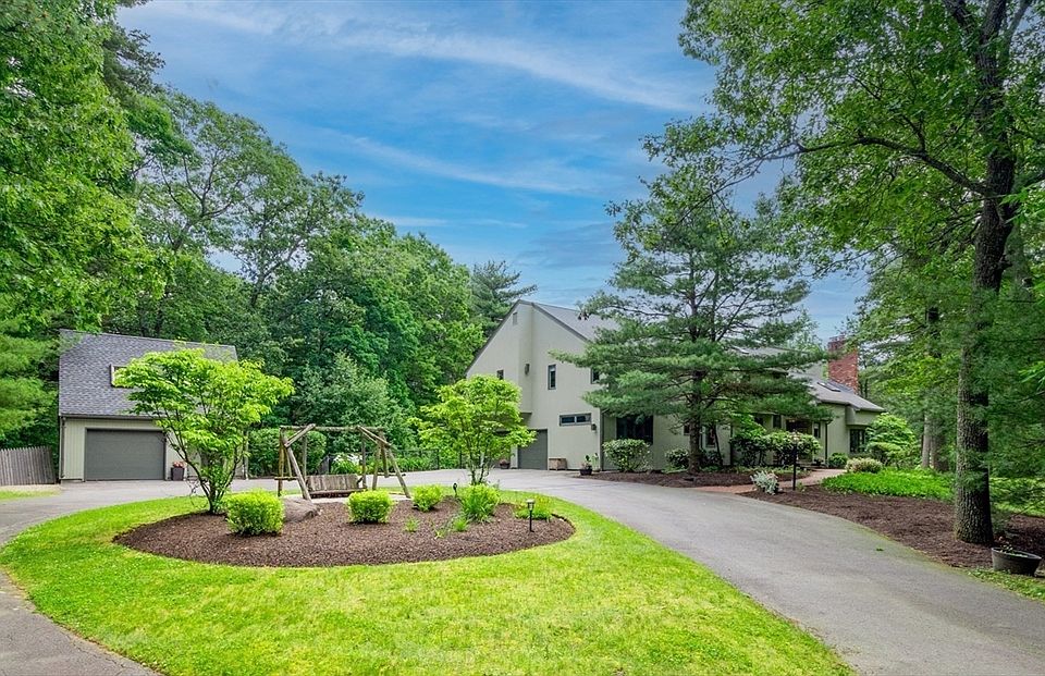 Stunning 5BR 4/2 BA Contemporary w/attached 2 car garage on 3.95 acres w/gunite pool, hard surface tennis/sport court, treehouse, detached garage w/finished room above & a trail to Little Farm Pond! The first floor open concept floorplan boasts a gorgeous eat in chefs kitchen w/Silestone countertops & island, Wolf gas cooktop, double wall ovens, built in Sub Zero refrigerator. Wonderful family room w/skylights, built in bookshelves, fireplace & cathedral ceiling; dining room, fireplaced living room, 2 home offices & 2 powder rooms. The kitchen & dining room open to the 37 x 13 Mahogony deck overlooking the park like grounds. Second floor offers 3 generous bedrooms, 3 full baths, laundry & primary suite w/attached nursery/office/yoga room. A recreation room, full bath & bedroom w/walk in closet complete the expansive walkout basement. 2024 6BR septic, skylights, pool coping & tile. Roof 2016. The quaint town of Sherborn offers top schools, an amazing trail system & Farm Pond!