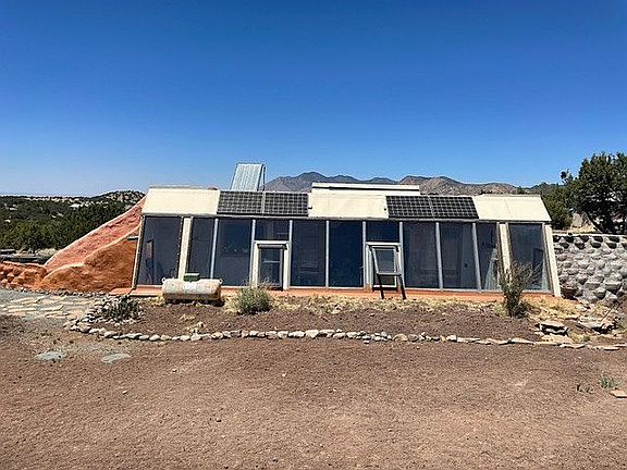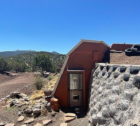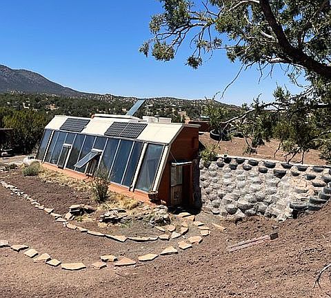 Small earthship. Custom kitchen and bath cabinets. Can go on town water or electric available. Car port. Newly graveled driveway. Tool shed. More tires to begin your next earthship next door and start a family compound. Property is AS IS.
