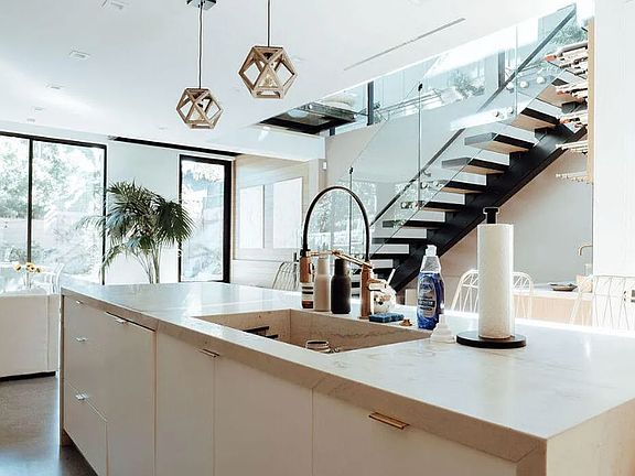The 2nd level features a spectacular glass loft overlooking the first floor, a family room, fireplace, laundry area and 2 additional bedrooms with private bathrooms. The 3rd level is an exceptional Master fit for a king. Wake up to views of the sun rising over the city with 2 walk in closets, a spa-like bathroom with a steam, a secret speak easy and beverage center, and cedar ceiling that carries out to cantilever over the deck with views. Walk up to the roof deck and enjoy 360 degree views from the snow peaked mountains in Big Bear to the blue waters and parachutes of the fun seeking beach lovers a block away. Enjoy the Jacuzzi tub, have a bbq, and have drinks around the fire pit under the stars.