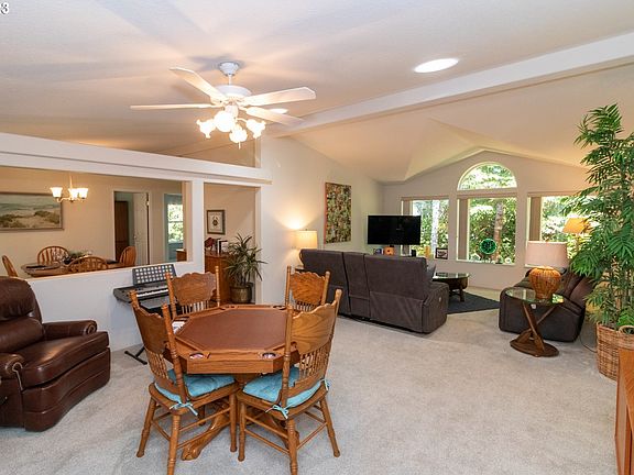 Beautifully maintained partially furnished 2 bedroom plus den/2 bath home. Private location on loop, only 1 block to the club house, across from lawn area. Primary bedroom on opposite end, large walk-in closet plus additional closet in ensuite bath. Updated kitchen with Corian counters, tile backsplash, newer appliances, nook, wood flooring in kitchen, dining and hallway. Tuff Spa hot tub (2022), new Sun Tuff patio cover. 27x44 RV garage with 12' door, 30 amp and dumpsite inside and out, loft/hobby room with 2 skylights and 3 windows plus workshop.
